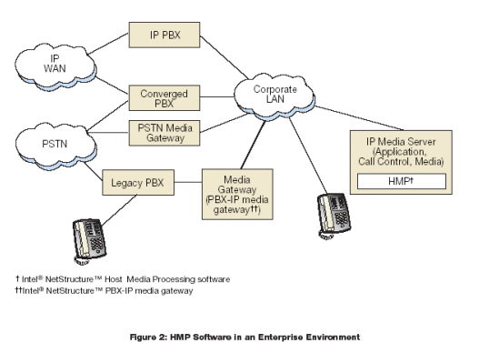 圖2表示使用HMP軟件的IP媒體服務(wù)器,部署在企業(yè)環(huán)境的例子,包括IVR,自動(dòng)應(yīng)答,語音郵箱,統(tǒng)一消息,語音識(shí)別和會(huì)議服務(wù)。