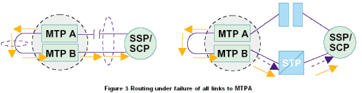 當(dāng)連接到MTP A或連接到 MTP B的鏈路發(fā)生故障時(shí),消息發(fā)送通過MTP A和MTP B之間的鏈路發(fā)送到另一個MTP,并在可用的鏈路上發(fā)送,如圖3。